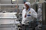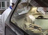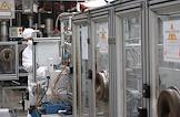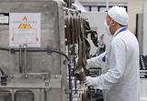 Работа ОАО "Новосибирский завод химических концентратов". Участок снаряжения тепловыделяющих элементов (ТВЭЛ) для атомных электростанций. Сотрудник в спецодежде на рабочем месте.