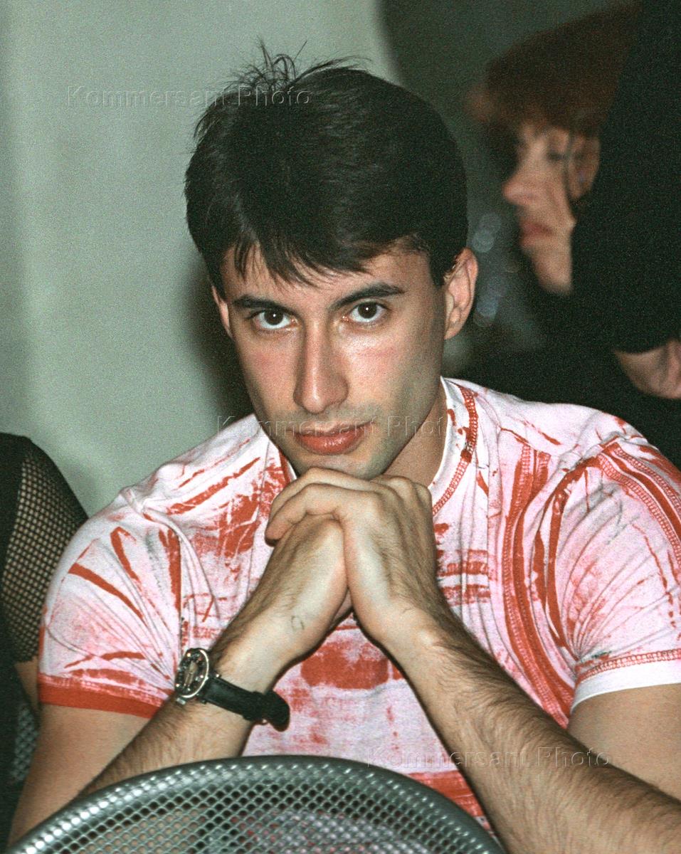 Vice president of Sibneft oil company Vladimir Ruga (left) bends over to look onto the Russian model Yekaterina Vitebskaya bosom during the celebration of the 3rd anniversary of the Fashion-TV representative office in Russia. The party was held in the Crocus City Mall.