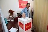 Общее собрание пермского регионального отделения партии "Родина". Выдвижение кандидатов на предстоящих 14 сентября выборах. Голосование. Урна с символикой партии.