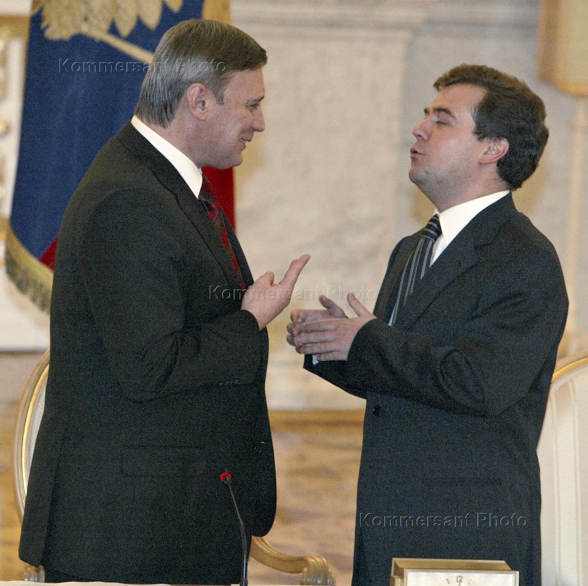 Председатель Правительства России Михаил Касьянов (слева) и руководитель администрации Президента России Дмитрий Медведев (справа) на совместном заседании Совета безопасности и Государственного Совета России. Заседание состоялось в Кремле.