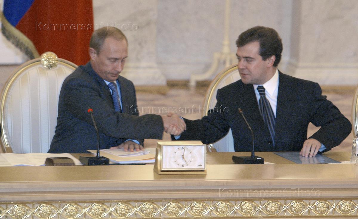 Председатель Правительства России Михаил Касьянов (слева) и руководитель администрации Президента России Дмитрий Медведев (справа) на совместном заседании Совета безопасности и Государственного Совета России. Заседание состоялось в Кремле.