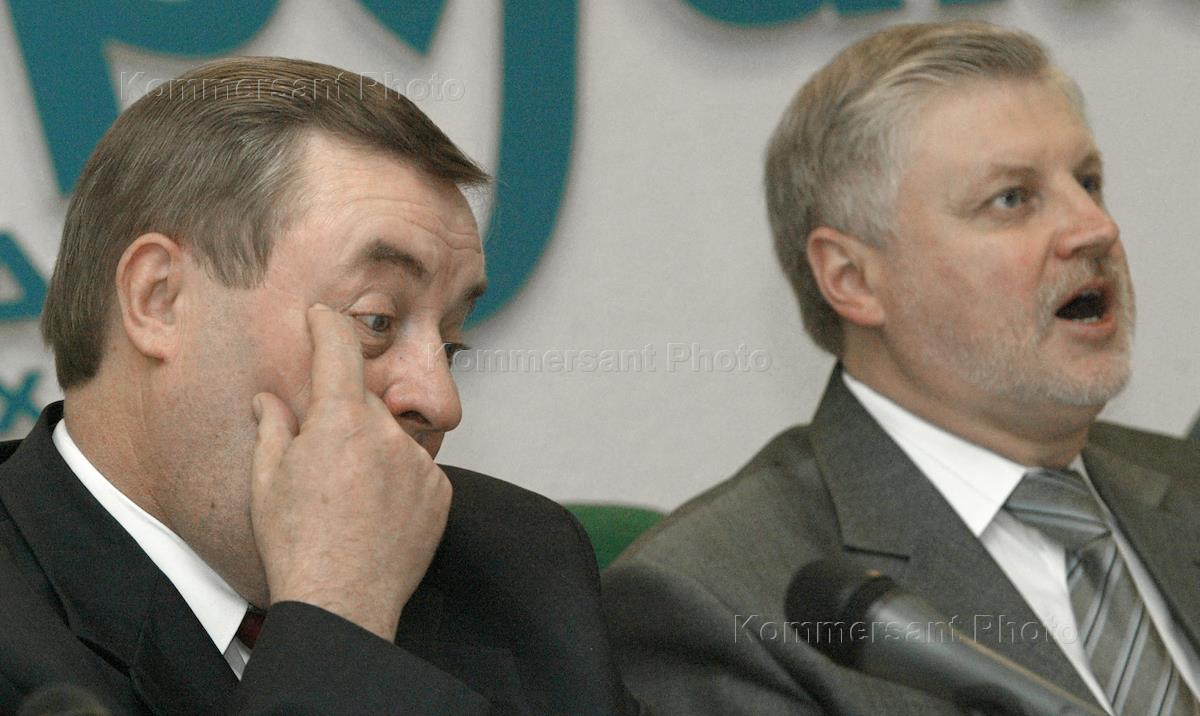Speakers Gennady Seleznev of the State Duma (left) and Sergey Mironov of the Federation Council (right) take part in the news conference headlined 'President's New Deal and New Agenda of the Russian Resurrection Party and Russian Life Party'. The news conference was held in the Interfax news agency.