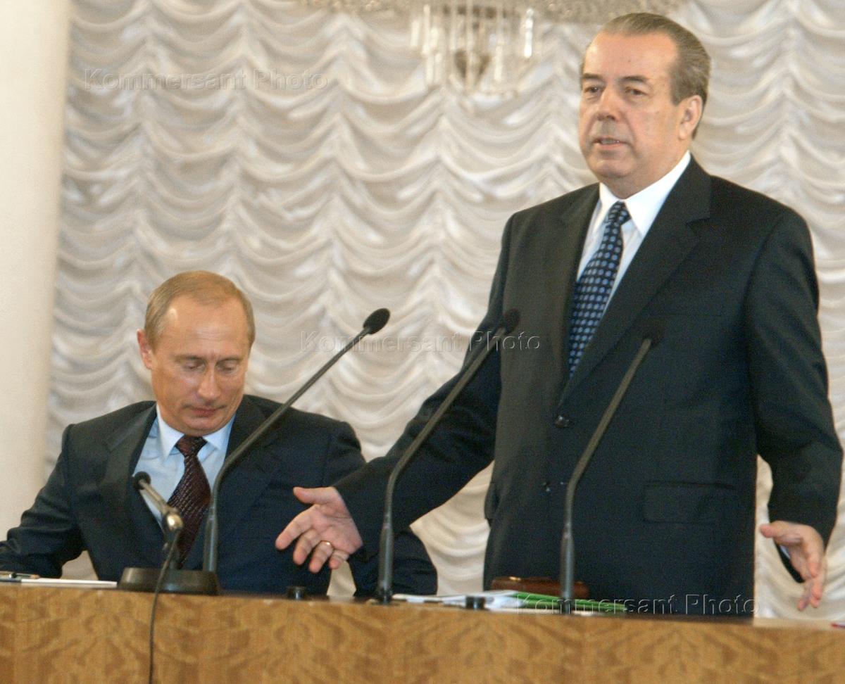 The Russian President Vladimir Putin (right) and president of the Russian Chamber of Trade and Industry Euvgeny Primakov (left) took part in the XIII meeting of the Russian Union of Industrialists and Entrepreneurs. The event was held in the Colonny Hall of the Unions's House.