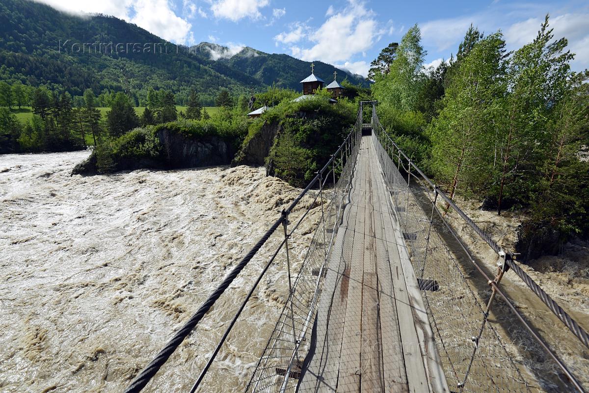 Паводок в Республике Алтай. Подвесной мост, ведущий на остров Патмос в селе Чемал.