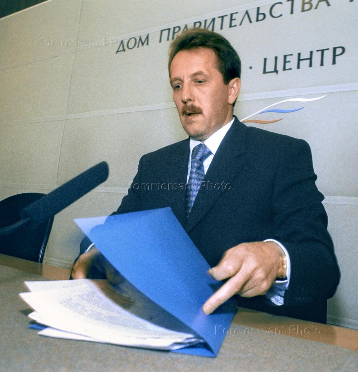 Russian Agriculture Minister Alexey Gordeyev is interviewed at the news conference held in the Moscow 'White House' (Russian Cabinet headquarters).