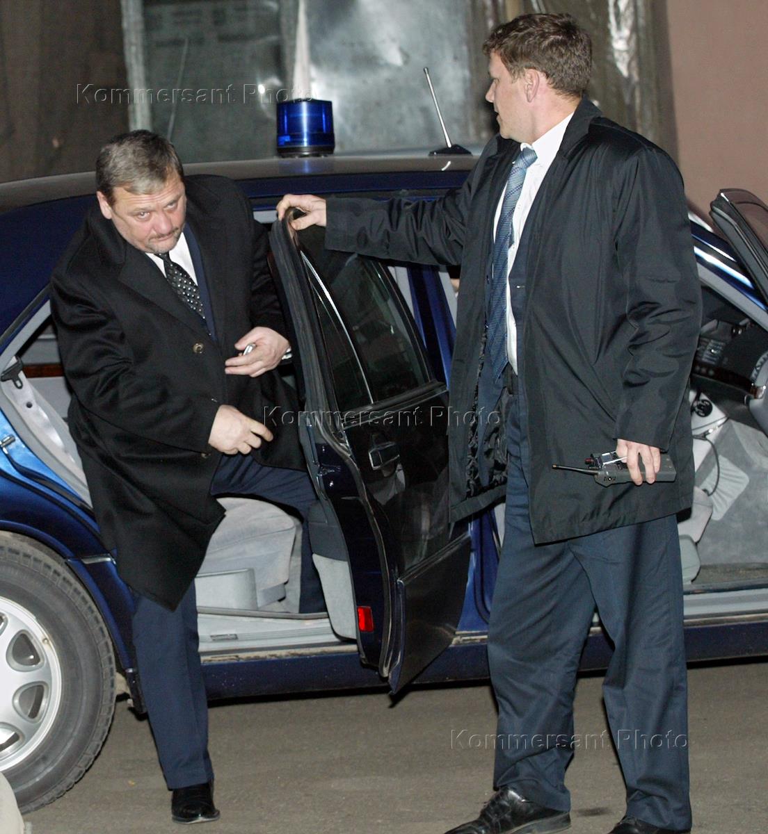 Chechen Republic President Ahmat Kadyrov (centre) arrives at the ITAR-TASS news agency headquarters to take part in the news conference summoned to discuss economic and social development of Chechnya.