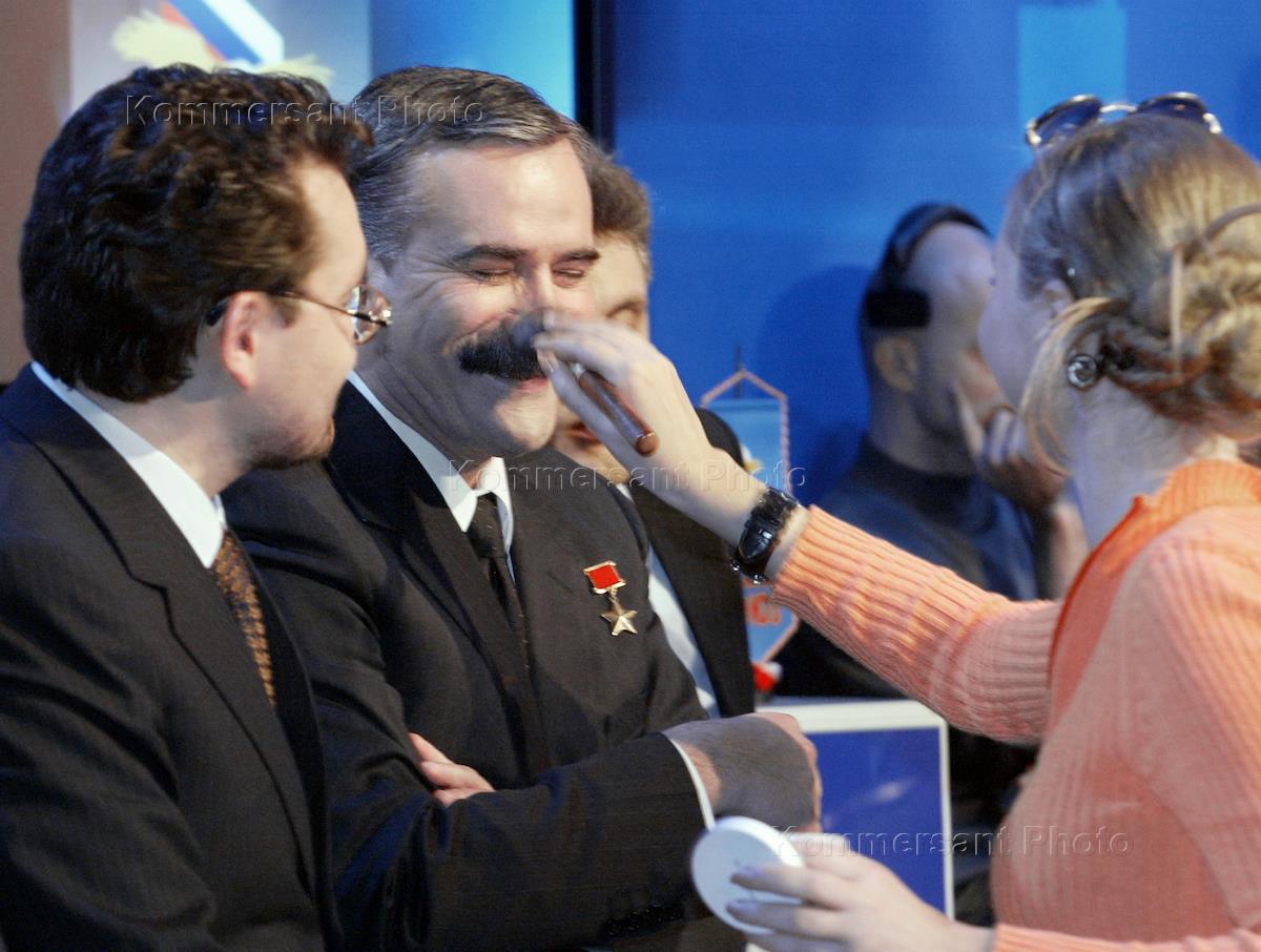 Журналист Эрнест Мацкявичус (слева), лидер Союза правых сил (СПС), депутат Государственной Думы России Борис Немцов (в центре) и госсекретарь Союза России и Белоруссии, председатель партии "Великая Россия - Евразийский Союз" Павел Бородин (справа) во время теледебатов в студии Всероссийской государственной телерадиокомпании (ВГТРК), посвященных выборам кандидатов в депутаты Государственной Думы России.