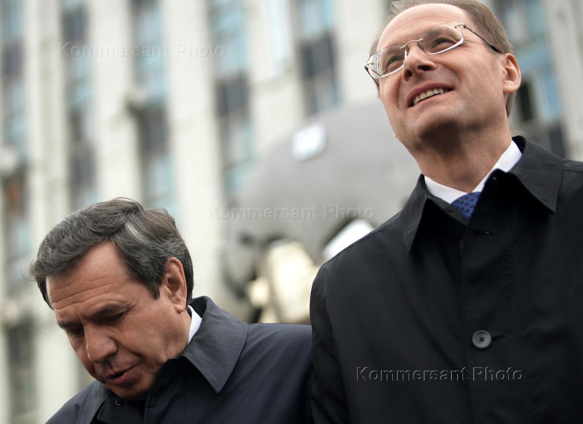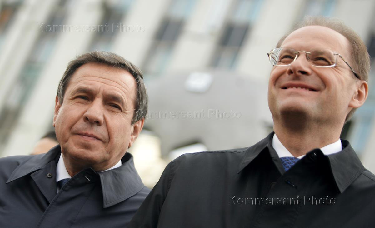 Мэр Новосибирска Владимир Городецкий (слева) и губернатор Новосибирской области Василий Юрченко (справа) на церемонии открытия сквера на пересечении улиц Советская и Вокзальной магистрали.