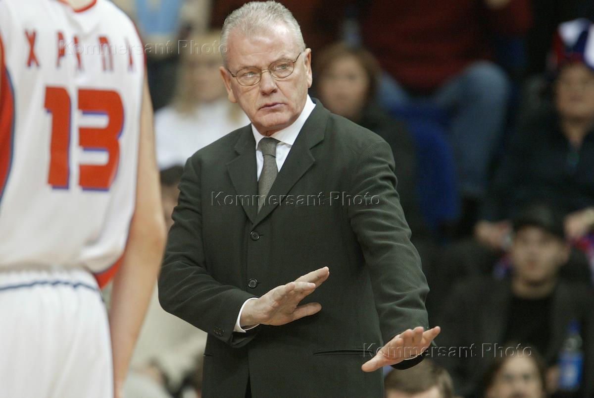 Chief coach of the Russian basketball team Stanislav Yeremin watches the CSKA(Moscow)/UNIX(Kazan) match eventually won by the Moscow team by 78:69.