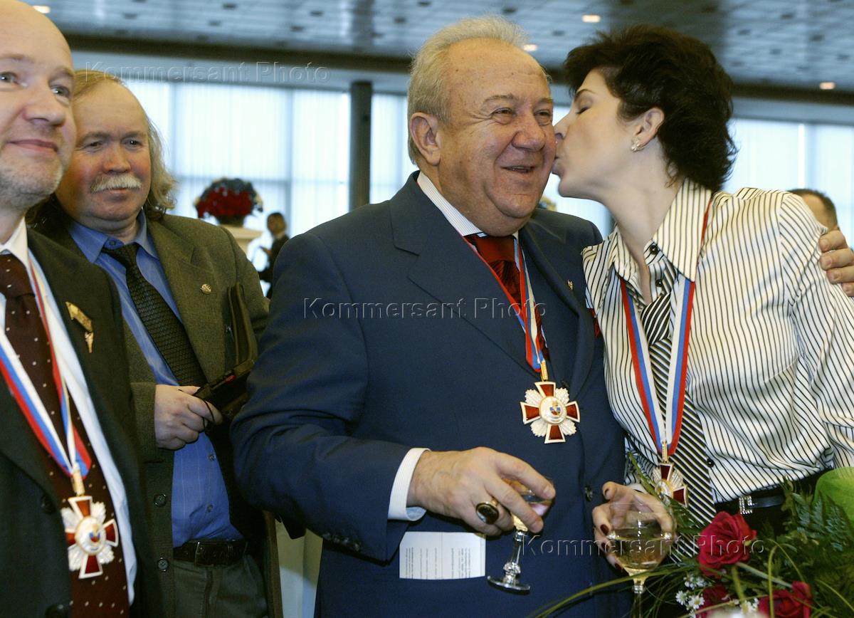 Artist and sculptor Zurab Tsereteli (left) kisses the president of Sovershenno Sekretno ('Top Secret') media holding Veronica Borovik-Hilchevskaya (right) in the lobby of the State Kremlin Palace during the Russian National Olymp awards ceremony.