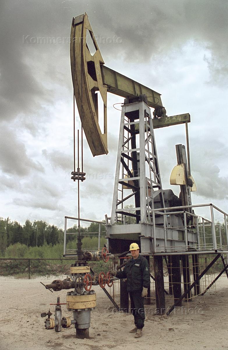 Рабочий у нефтяной скважины на Западно-Сибирском нефтедобывающем комплексе.