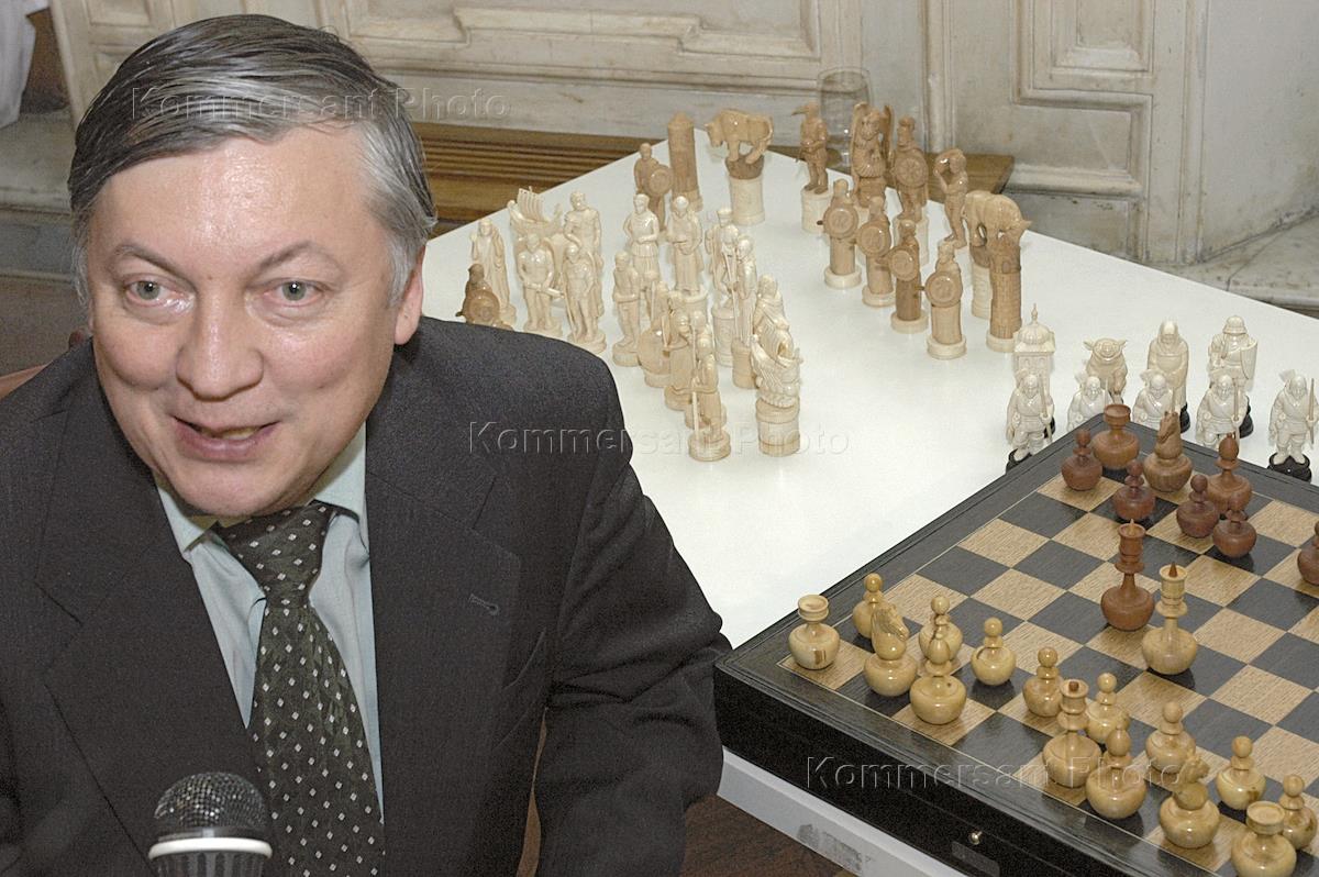 World Chess Champion Anatoly Karpov is interviewed at the exhibition staged in the Central Journalist House to present chess sets carved out of mammoth bones.