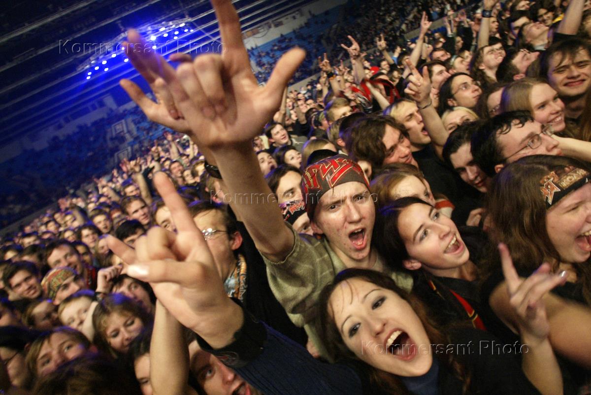 Зрители на концерте группы "Ария" "Крещение огнем" в спорткомплексе "Лужники".