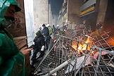 Евромайдан после ночи противостояния. Уличные бои не утихают. Баррикада со стороны Консерватории. Вид на сгоревший ночью Дом Профсоюзов.