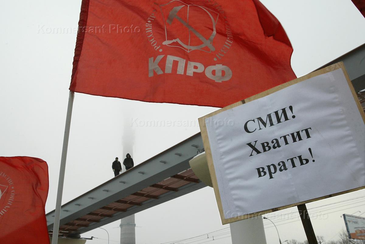 Near the Ostankino television center was held the rally against "unfair activity of the state TV channels". Red flags of the Russian Communist Party (CPRF) and "Media! Stop lying!" poster.