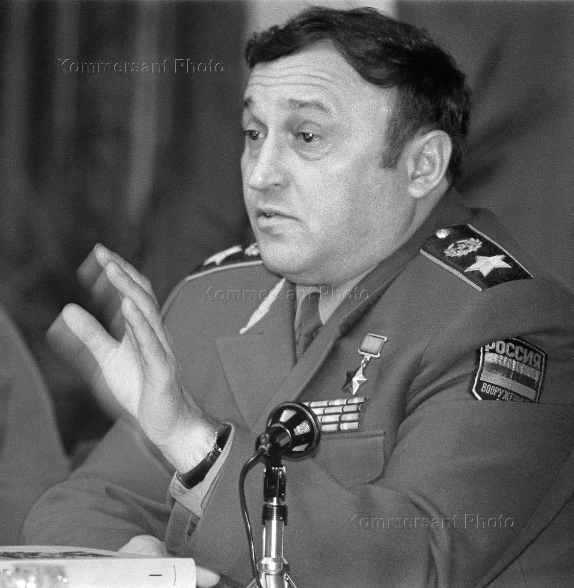 Nikita Mikhalkov, highly-regarded filmmaker and Cinematography Union head (rignt) is received by Defence Minister Pavel Grachev (left).