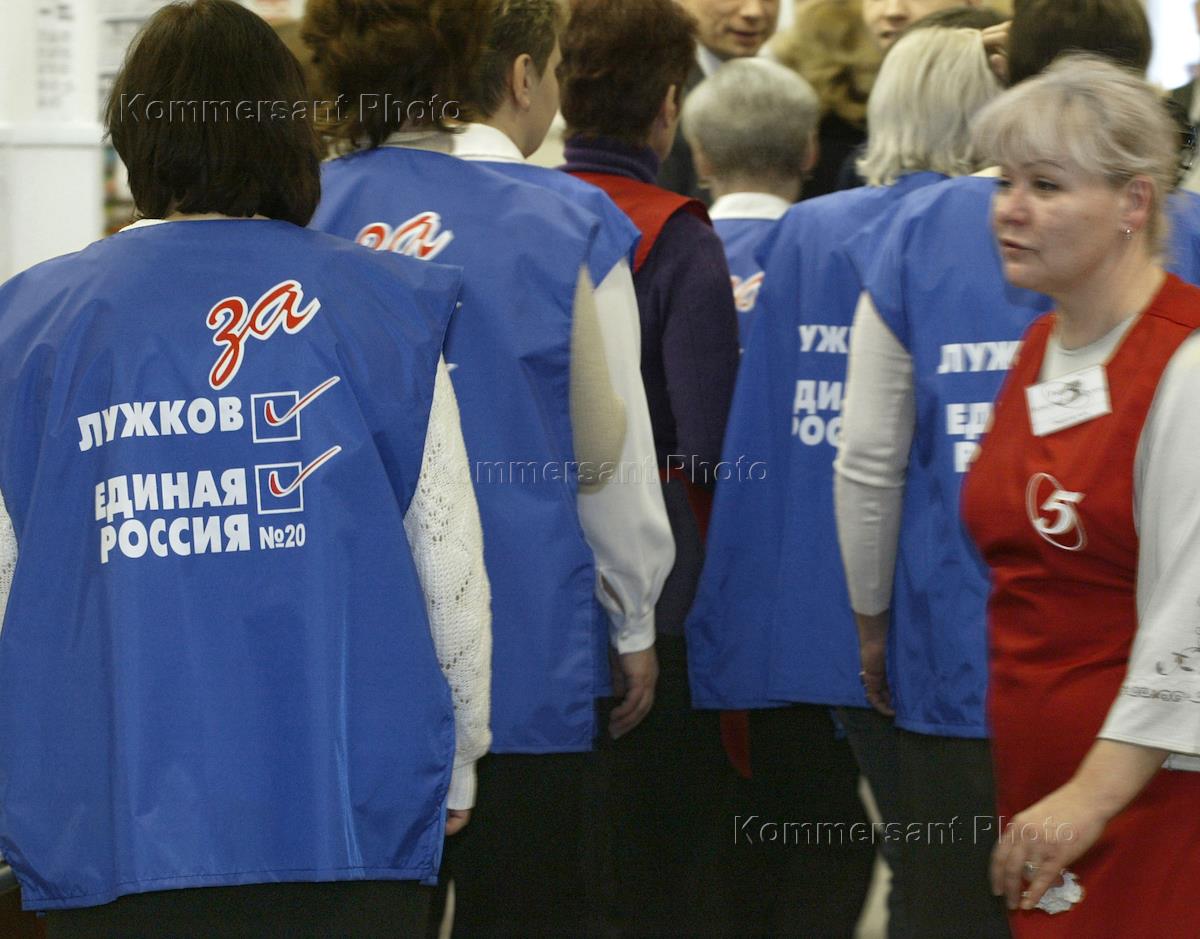Salesgirls of the popular Moscow retail chain - Pyaterochka ('Fiver') wear jackets urging people to vote for the current Moscow Mayor Yury Luzhkov and pro-Kremlin party 'United Russia'.