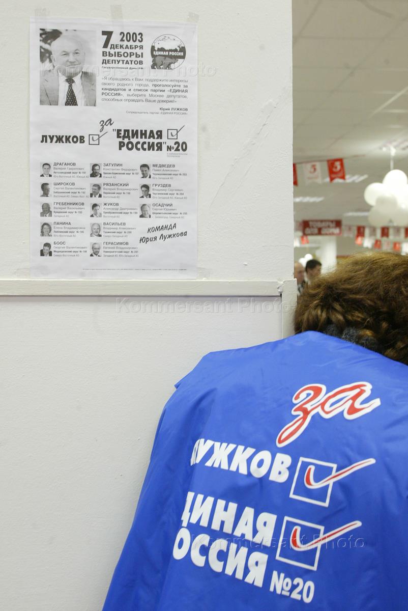 Salesgirls of the popular Moscow retail chain - Pyaterochka ('Fiver') wear jackets urging people to vote for the current Moscow Mayor Yury Luzhkov and pro-Kremlin party 'United Russia'.