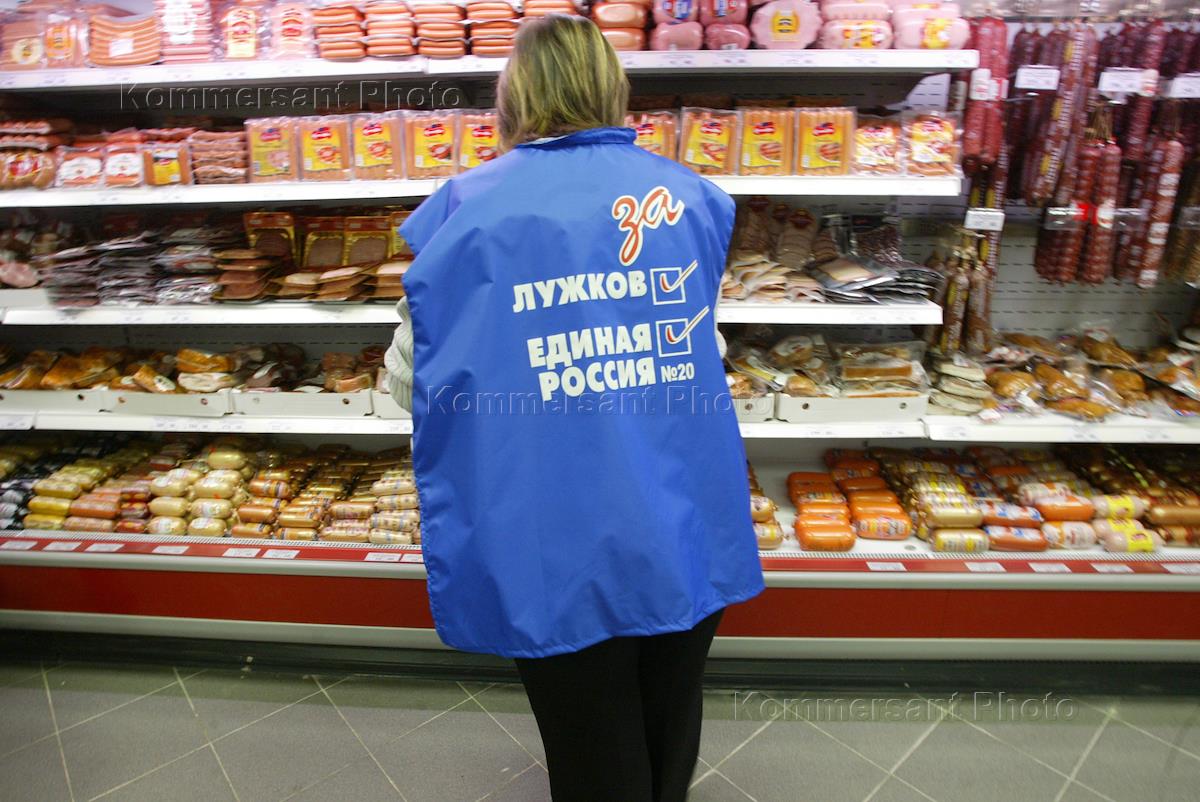 Pre-election campaign of Moscow Mayor. Girls in the jackets agitating for Yury Luzhkov and the United Russia party are in the "5 Pyaterochka" market.