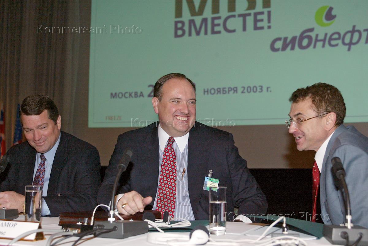 Вице-президент НК "ЮКОС" Стивен Тиди (слева), вице-президент по экономике и финансам НК "ЮКОС" Брюс Мизамор (в центре) и председатель правления компании "Юкос-Москва" Семен Кукес (справа) во время пресс-конференции по итогам заседания правления компании "ЮКОССибнефть". Пресс-конференция прошла в гостинице "Рэдиссон-Славянская".