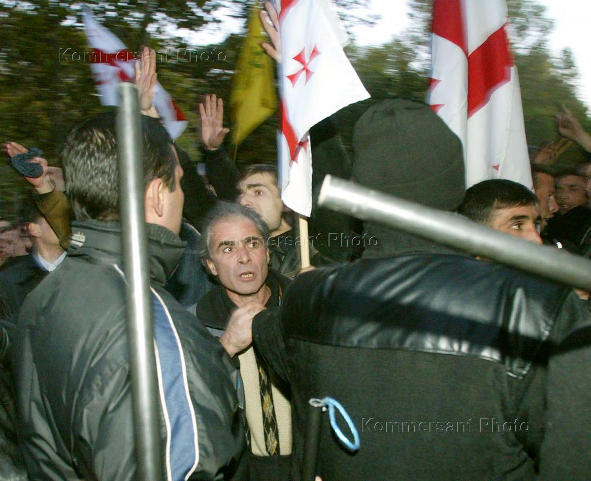 Leaders of the Georgian opposition parties Nino Burdjanadze (left), Zurab Zhvania (right) and Mikhail Saakashvili (looming behind Mr Zhvania's right shoulder) address their supporters during an anti-presidential rally.