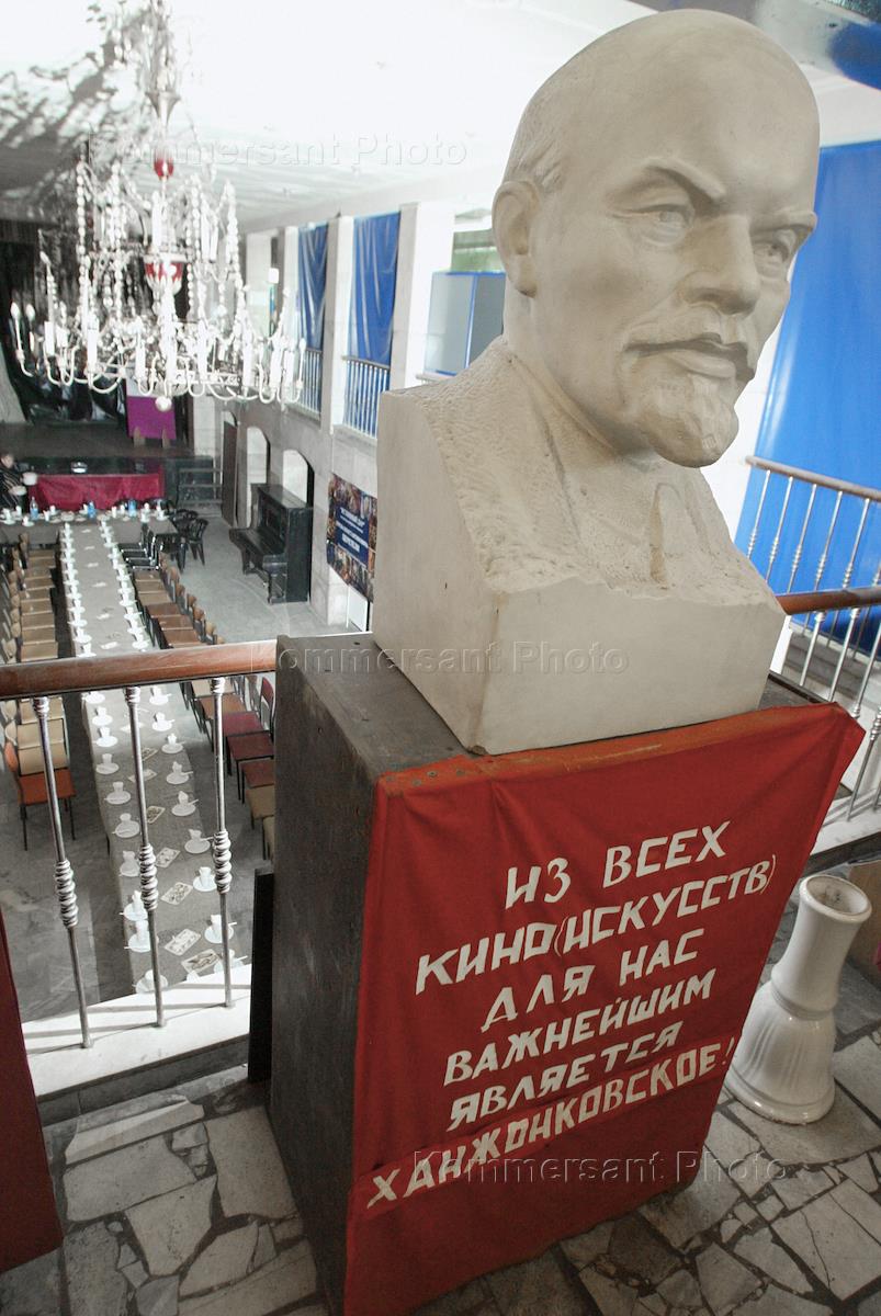 Бюст вождю революции Владимиру Ленину и надпись на постаменте "Из всех киноискусств для нас важнейшим является Ханжонковское". Бюст стоит в фойе кинотеатра "Дом Ханжонкова".