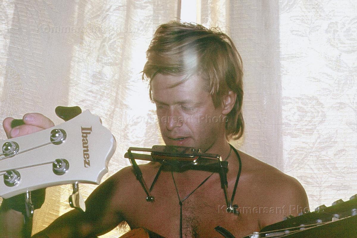 Frontman of the Aquarium rock-band Boris Grebenshchikov takes part in a rehearsal held in his apartment.