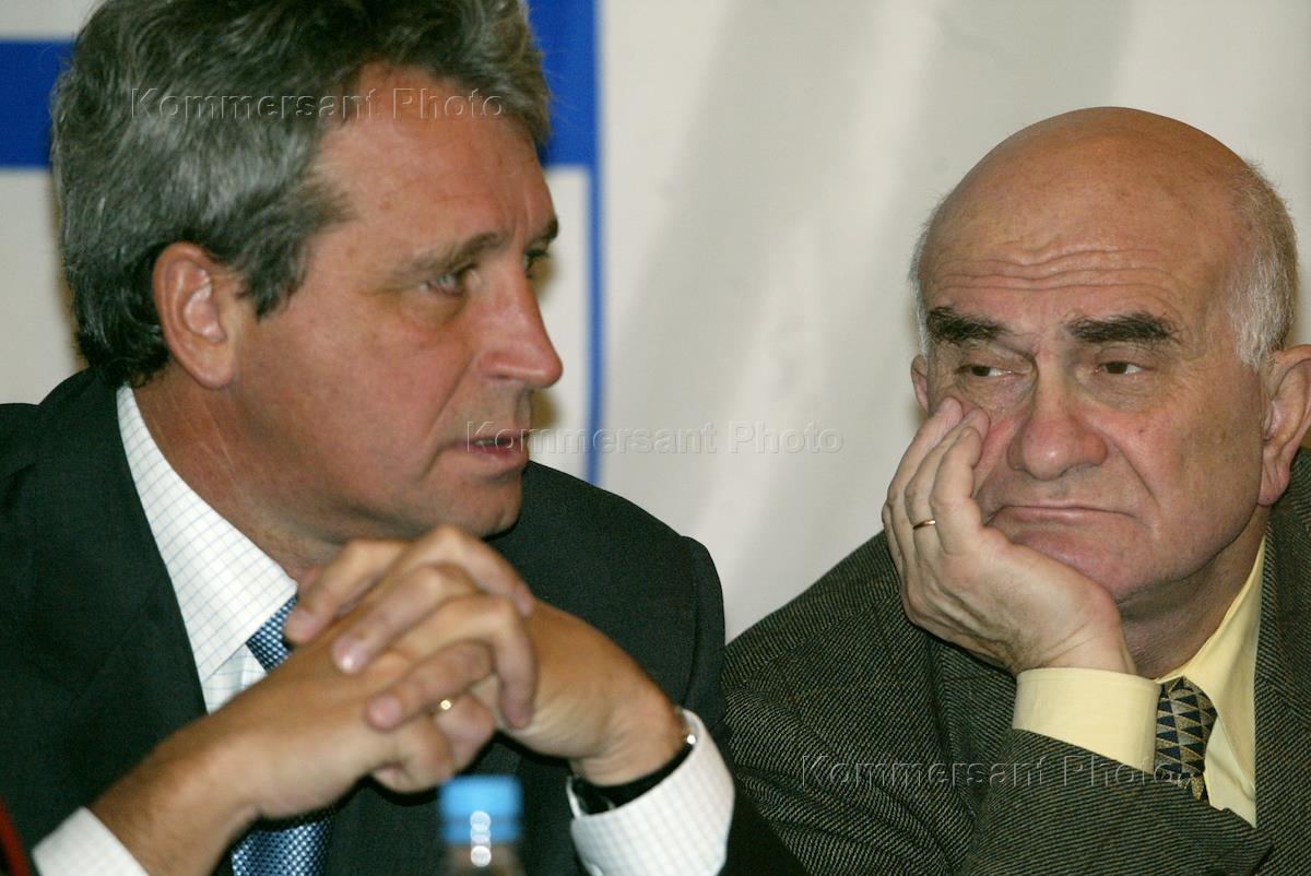 Экономист, научный руководитель Государственного Университета "Высшая школа экономики" Евгений Ясин (слева) и председатель наблюдательного совета инвестиционной группы "Ренессанс Капитал" Александр Шохин (справа) во время ежегодной конференции "Российский бизнес. Повестка дня - 2004". Конференция прошла в гостинице "Марриотт Роял Аврора".