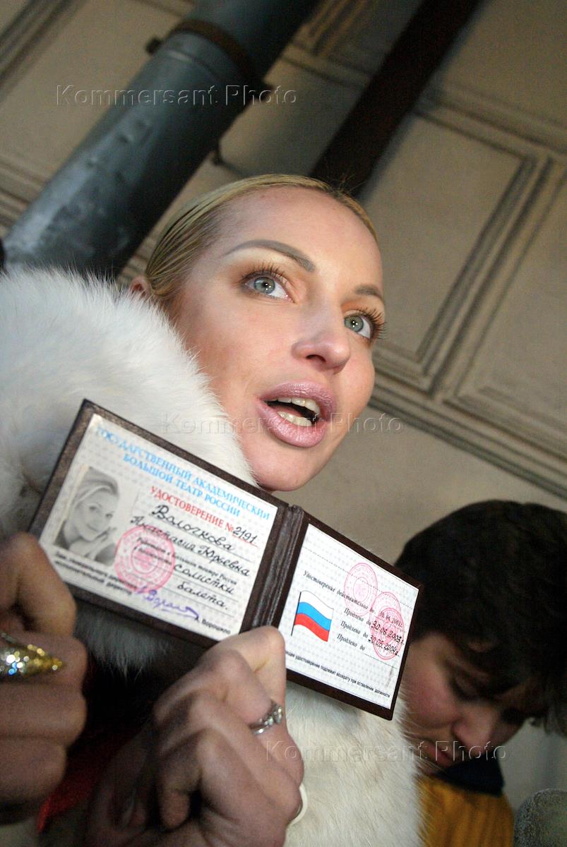 Балерина Анастасия Волочкова возвратилась в Большой театр. 3 декабря должно стать первым рабочим днем после восстановления ее в театре. Волочкова показывает журналистам свое удостоверение артистки Большого театра.