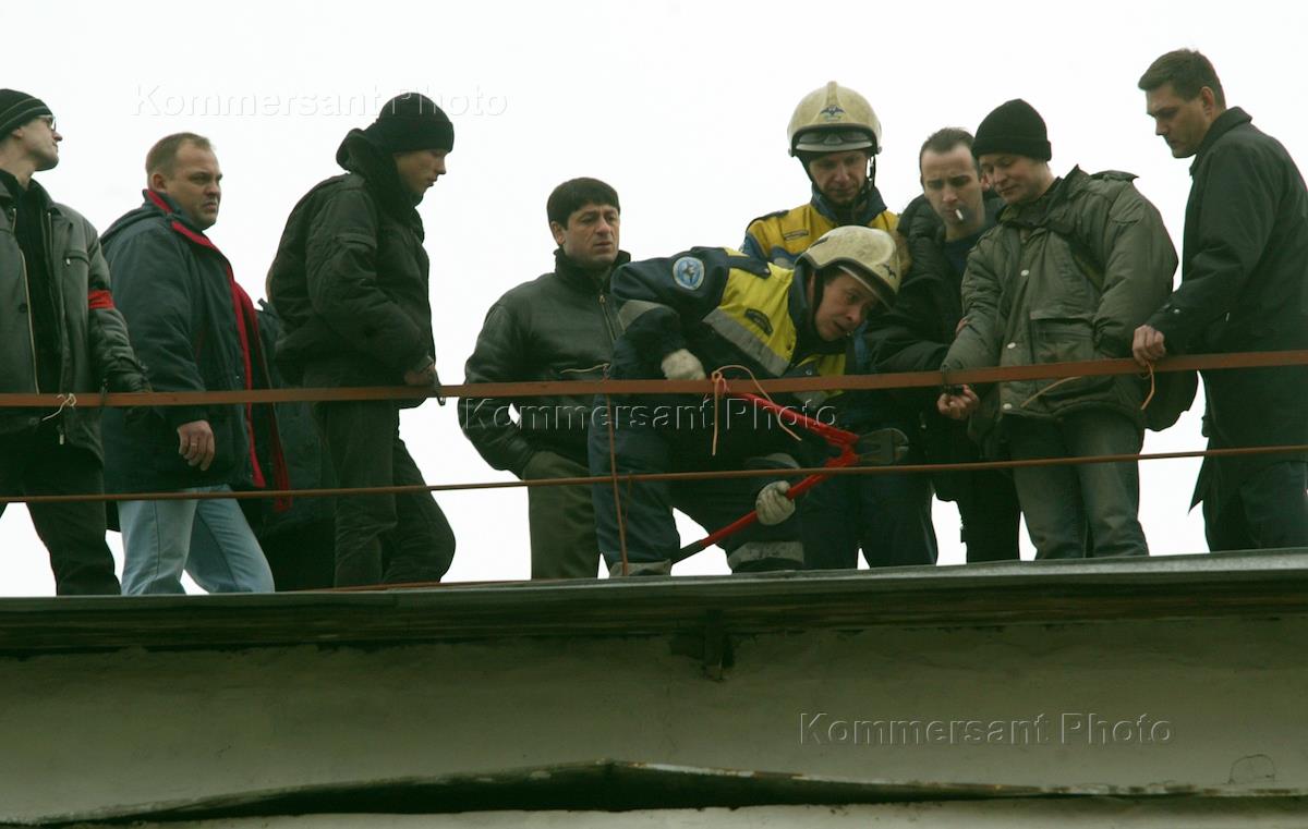 Policemen break the handcuffs used by activists of the Russian National Bolshevik Party (NBP) to fast themselves to the railings of the roof of the Russian Justice Ministry headquarters. The action was staged to denounce the Ministry's repeated refusals to register the NBP.