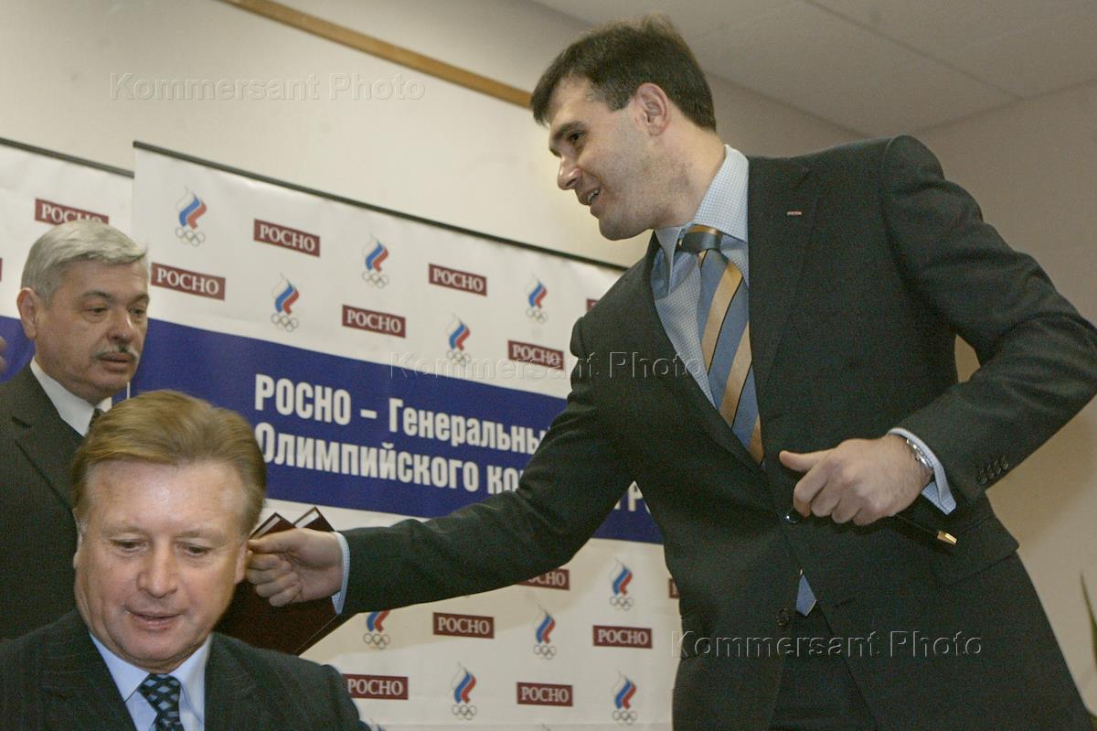 President of the Russian National Olympic Committee (OKR) Leonid Tyagachev (sitting left) attends signing of the agrement between OKR and ROSNO insurance company by ROSNO Director General Leonid Melamed (right) and OKR officials. The event took place in the Golden Ring Hotel.