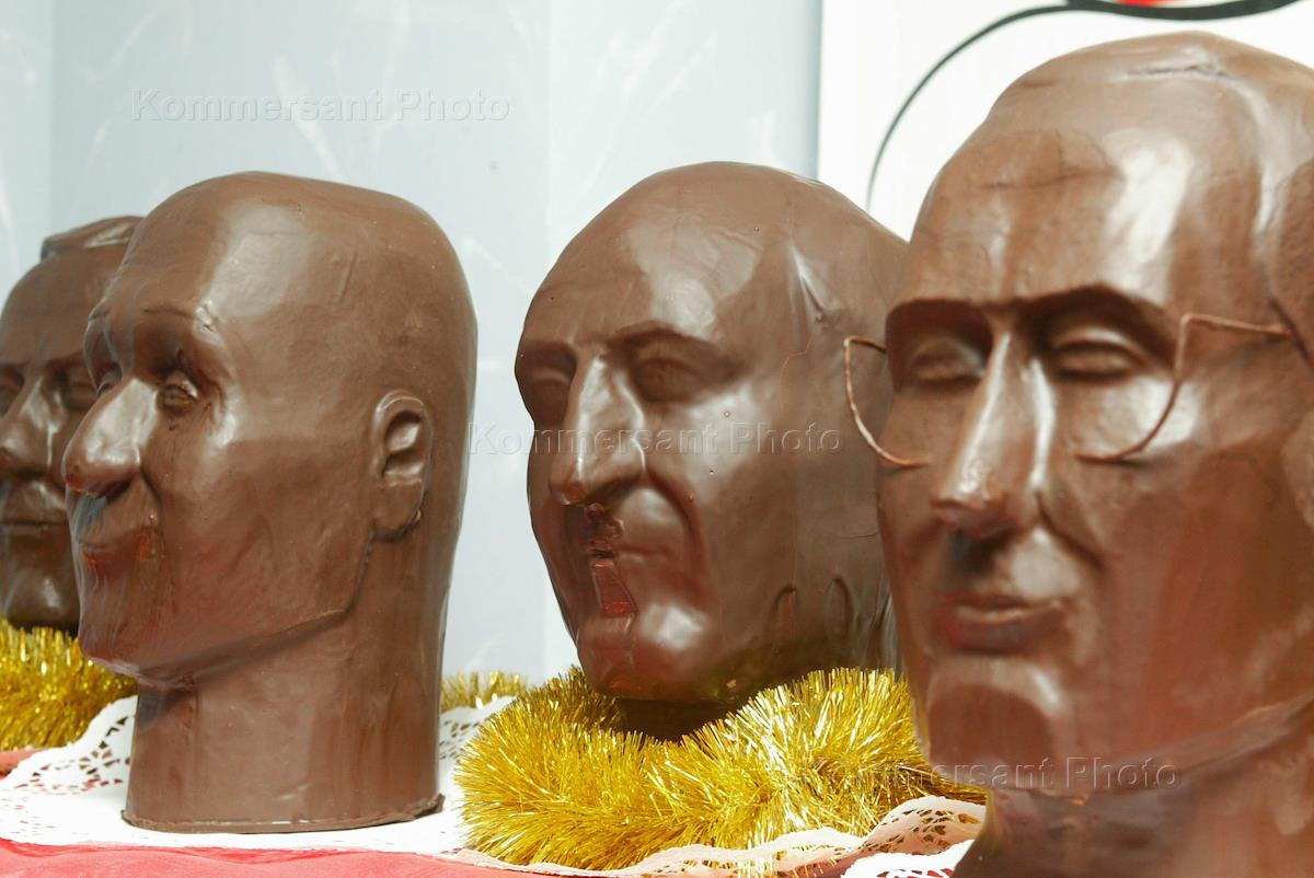 Выставка шоколадных бюстов российских олигархов "Сладенькие наши", организованная агентством "Назаров и Партнерши". В экспозиции - шампанское с этикеткой "Дерипаска О.В.". Выставка прошла в кинотеатре "Пионер" кафе "Зазеркалье".