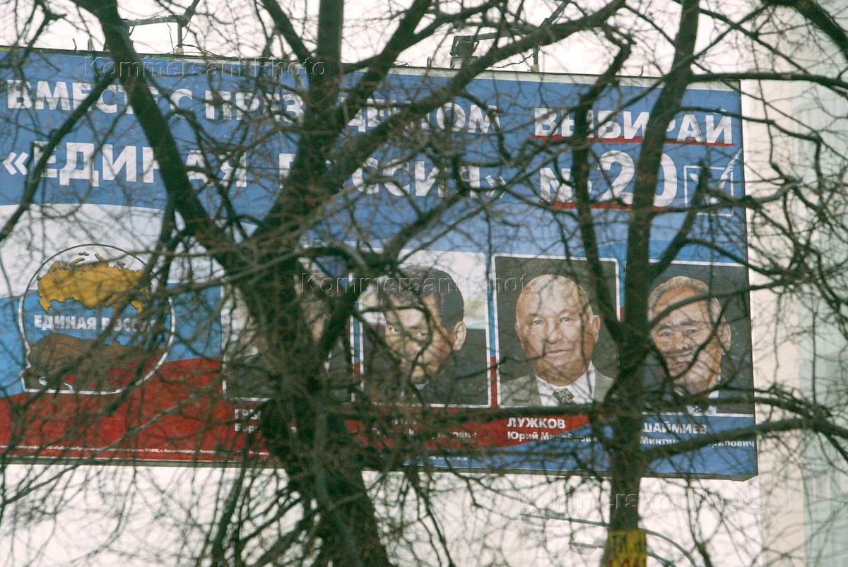 Предвыборная агитация. Рекламный щит партии "Единая Россия" с портретами лидеров партии.