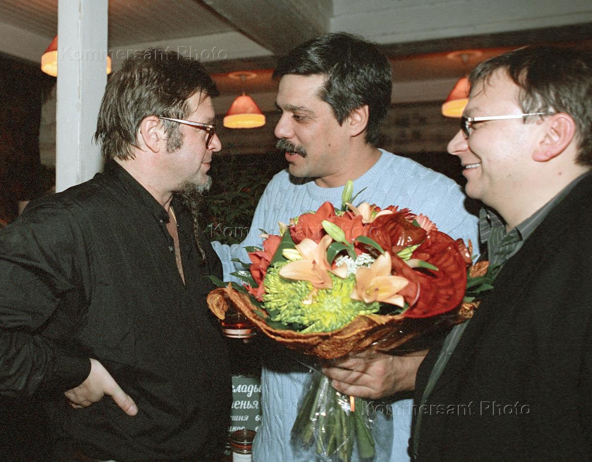 Frontman of the Aquarium - a veteran Russian rock band - Boris Grebenshchikov (lefT) is congratulated on his 50th birthday by the president of the Triumph Foundation Igor Shabdurasulov (centre) and popular comic Igor Ugolnikov (right). The birthday party was held in the Dacha Art Gallery.