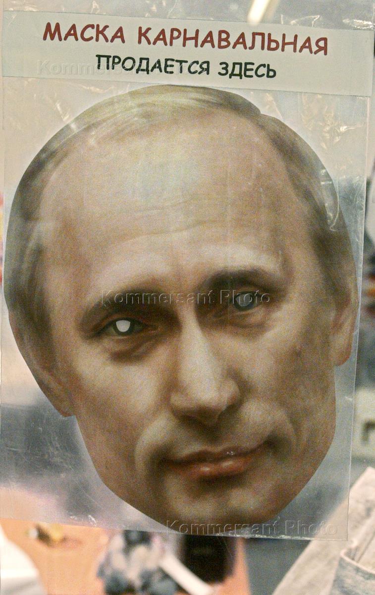 A carnival mask bearing of Vladimir Putin displayed in a shop window.