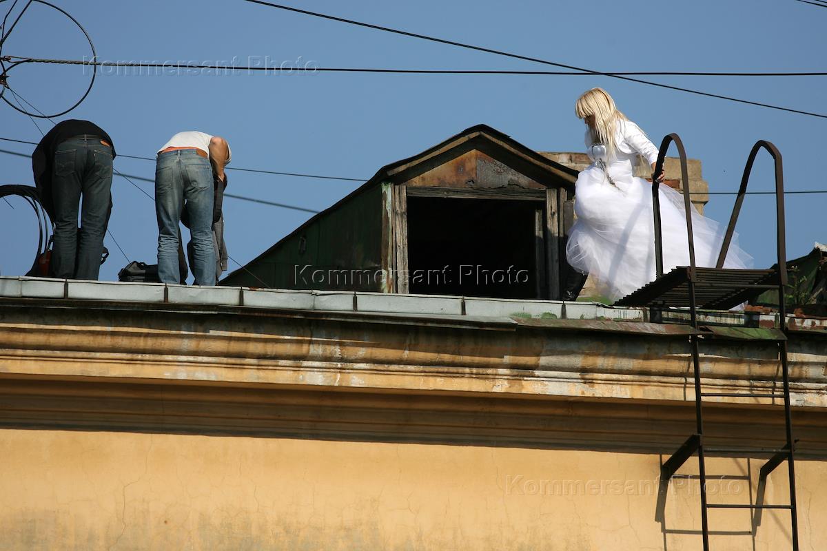 Жанровая фотография. Девушку в платье невесты фотографируют на крыше дома.