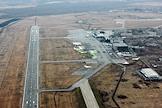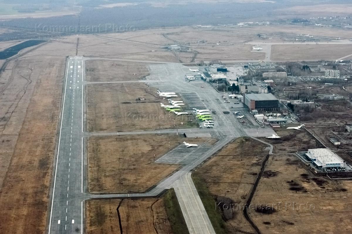 Вид на первую ВПП и терминал аэропорта "Толмачево" города Новосибирска из иллюминатора аэробуса А320 во время выполнения первого технического рейса по маршруту "Новосибирск - Горно-Алтайск - Новосибирск".