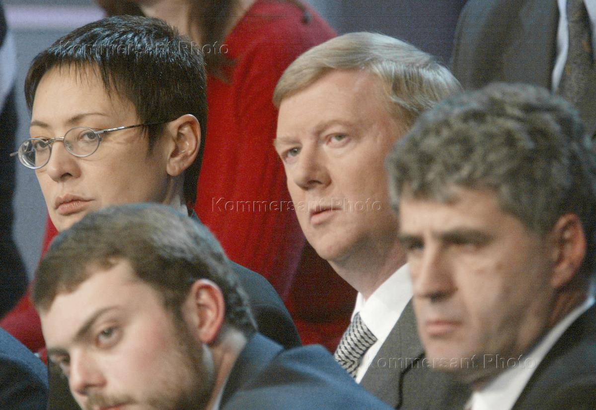 Vice-chairman of the 'Union of the Right Foreces' (SPS) Irina Khakamada (left) and Unified Energy Systems of Russia CEO Anatoly Chubays (centre) take part in the NTV show 'Freedom of Speech'.