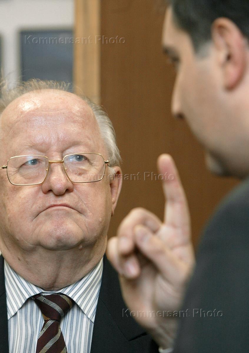 Former chairman of the Russian Central Bank Victor Gerashchenko (left) and former chairman of the State Duma International Affairs Committee Dmitry Rogozin (right) get ready for the pre-electoral television debates held in the run-up to the parliamentary election.