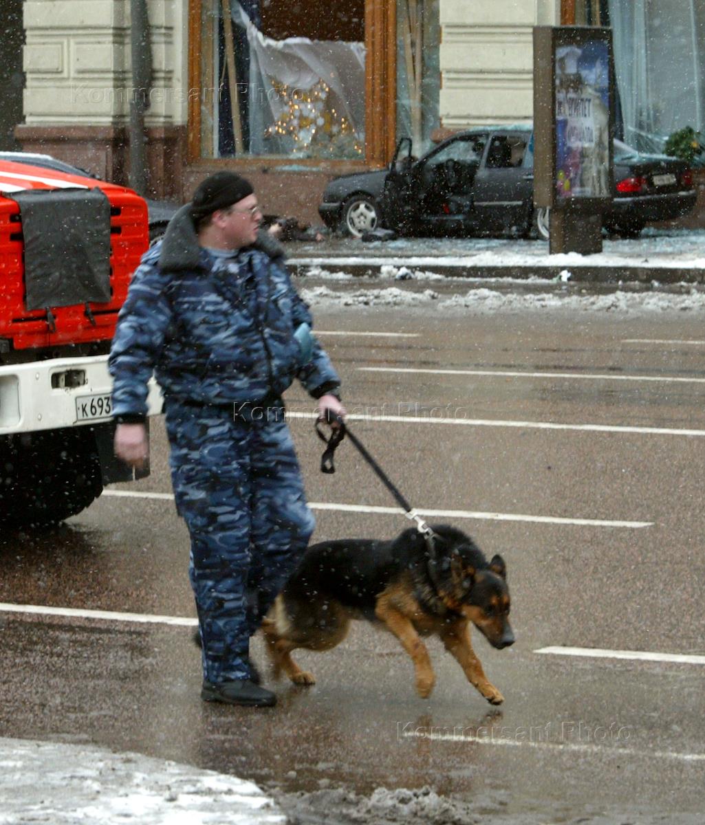 A policeman with an Alsatian trained to find explosives arrives at the National Hotel in the centre of Moscow after a bomb attack which killed 5 and wounded 13 people. The attack was carried out by a female suicide-bomber.