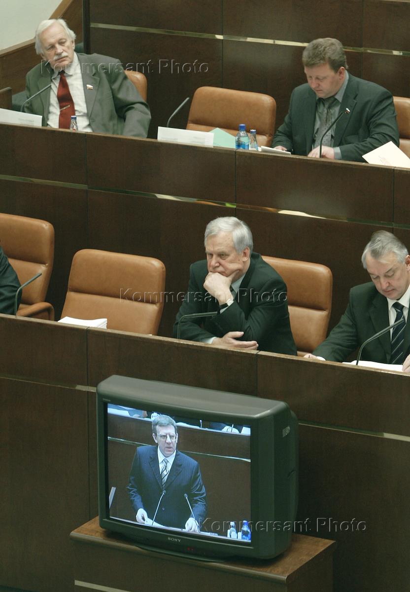 Russian Deputy Prime Minister, Finance Minister Alexey Kudrin (centre) and the Vologda Oblast Governor Valery Fedorov (right) attend the last meeting of the Federation Council (upper house of parliament) in the year 2003.