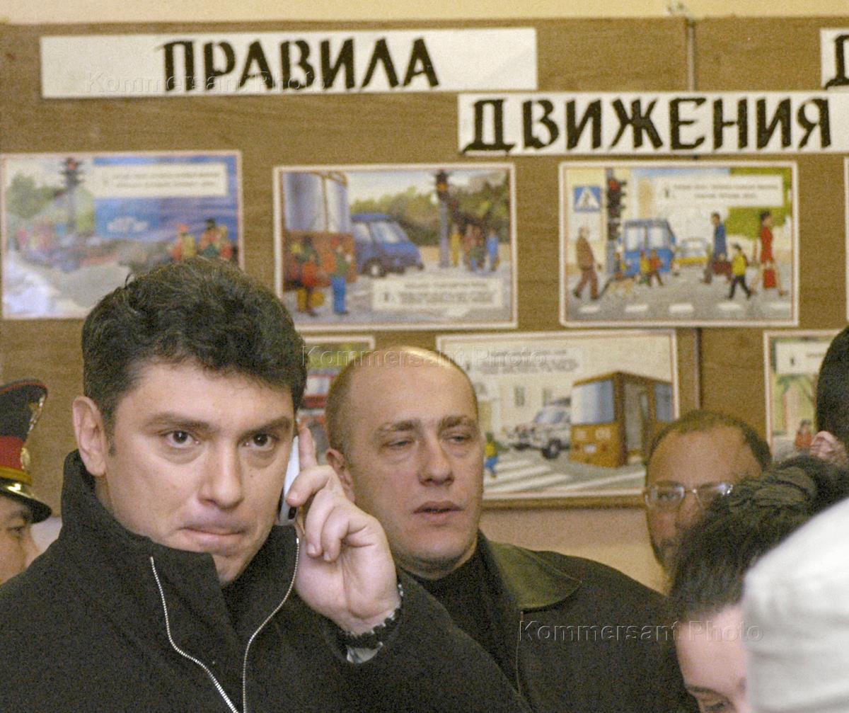 Leader of the 'Union of the Right Forces' party (SPS) Boris Nemtsov (left) arrives at the polling station number 131 to cast his vote in the parliamentary election.