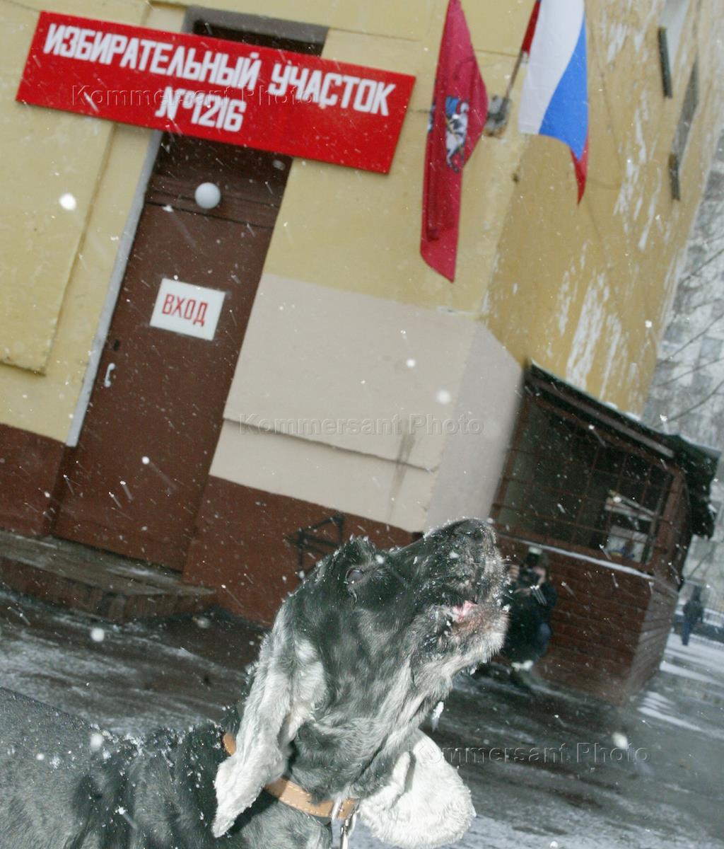 A dog in front of the polling station number 1216 during the parliamentary election.