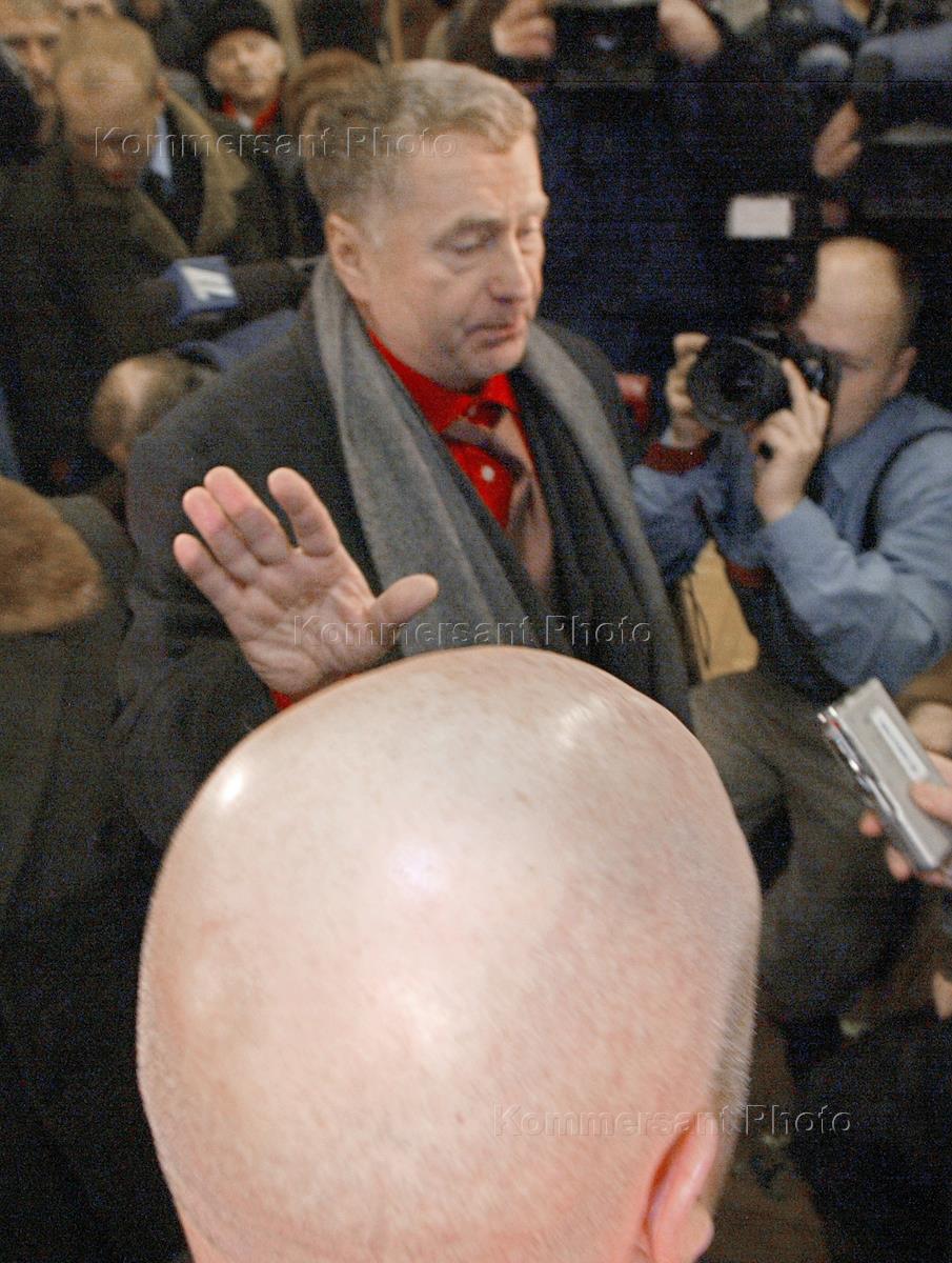 Maverick leader of the Liberal Democratic Party (LDPR) Vladimir Zhirinovsky (right) watches his assistant pushing aside a woman at the polling station 1216 during the parliamentary election.
