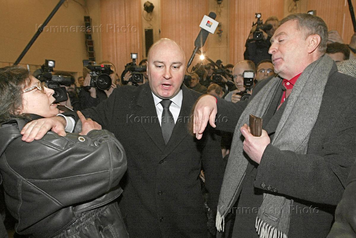 Maverick leader of the Liberal Democratic Party (LDPR) Vladimir Zhirinovsky (right) watches his assistant pushing aside a woman at the polling station 1216 during the parliamentary election.