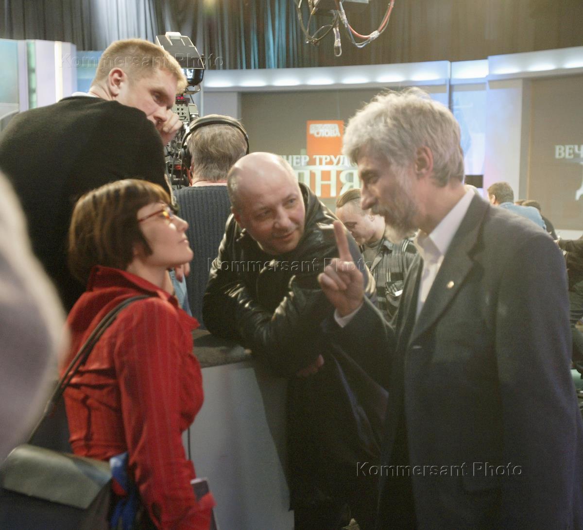 Member of the Moscow city legislature Yevgeny Bunimovich (left) and host of the NTV 'Freedom of Speech' and 'Impact' political shows Savik Shuster (right) take part in the special NTV show aired to cover parliamentary election.
