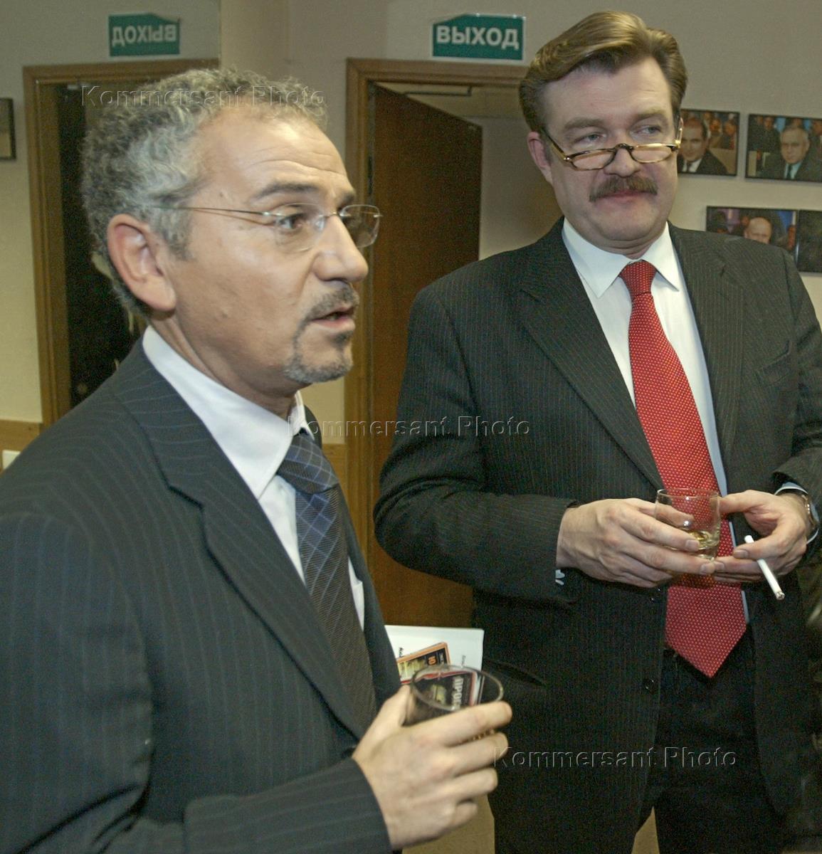 Выборы депутатов Государственной Думы России. Главный редактор газеты "Московские новости" Евгений Киселев (слева) и руководитель объединенной редакции программ "Свобода слова" и "Влияние" телеканала НТВ Савик Шустер (справа) во время телепередачи на канале НТВ, посвященной освещению хода голосования и подведения предварительных итогов выборов.