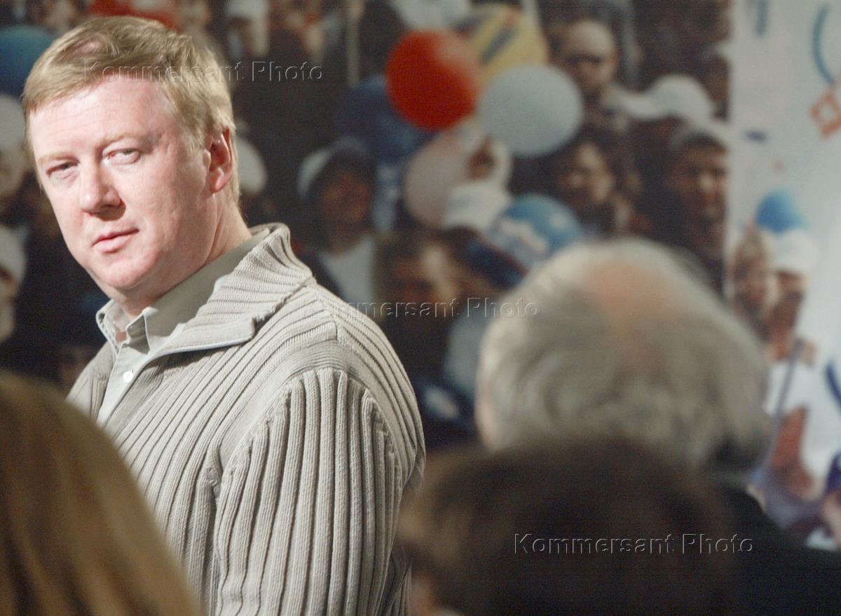 Co-chairman of the 'Union of the Right Forces' (SPS) party, Unified Energy Systems of Russia CEO Anatoly Chubays is interviewed in the SPS electoral staff headquarters after announcement of the parliamentary election preliminary results.