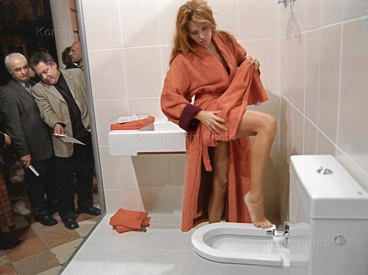 A model poses for a photo during the Joop bath and toilet appliances and sanitary equipment exhibition.