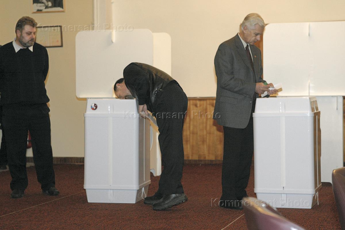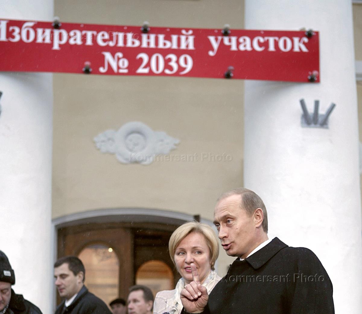 Выборы депутатов Государственной Думы России. Голосование на избирательном участке № 2039. Президент России Владимир Путин с супругой Людмилой во время голосования.